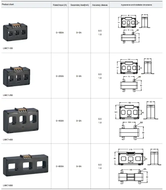 The LMK7 series low voltage current transformer is a three-phase current transformer specially designed for collecting current signals in low-voltage AC circuits. Its design strictly follows the threading dimensions of the CM1 molded case circuit breaker standard, ensuring seamless integration with common switchgear. This current transformer features a wide measurement range, with a rated primary current up to 1000A and a rated secondary current range from 20mA to 5A. It is manufactured using an excellent and advanced production process and complies with IEC 61869. The LMK7 series adopts a core piercing structure with flame-retardant epoxy resin casting, offering good stability, high linearity, high sensitivity, and strong anti-electromagnetic interference capability.