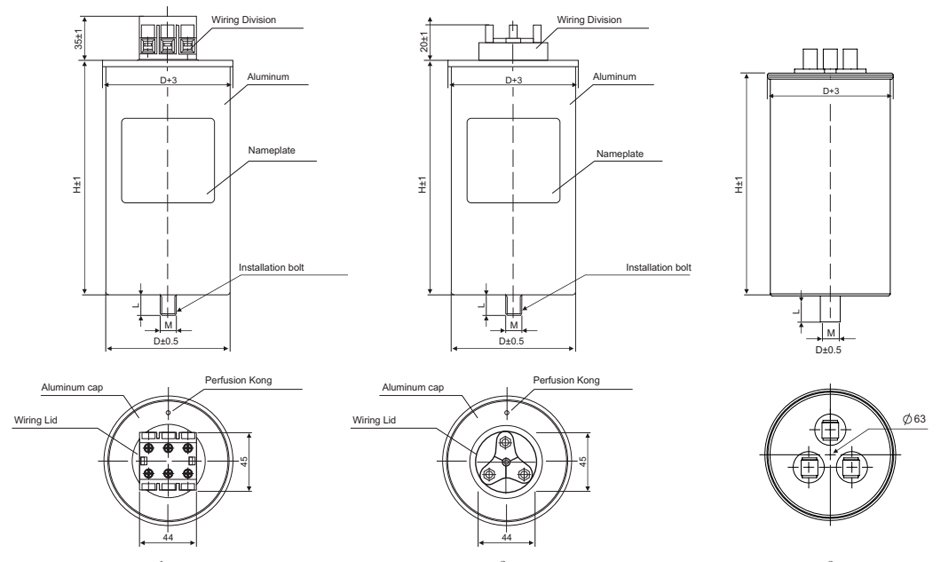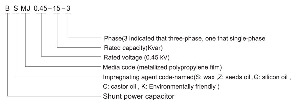 | Model BSMJ | Rated line voltage (KV) | Rated phase voltage (KV) | Three-phase capacity (Kvar) | Rated Capacity (μF) | Rated Current (A) | Dimension (mm) | Connection | Bottom Bolt |