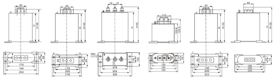 | Model BSMJ、BCMJ、BZMJ | Rated Volt. (KV) | Rated Capacity (Kvar) | Rated Capacity (μF) | Rated Current (A) | H (mm) | Outgoing terminal | Drawing No. |